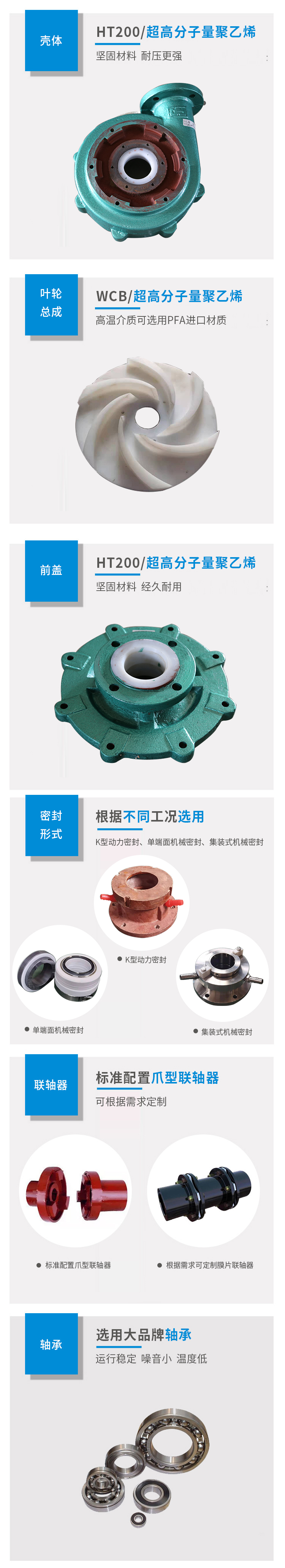 一種泵能適應各種不同的工況。如:既可以輸送酸、堿類清液或料漿,也可以輸送冶煉行業各種腐蝕性礦漿,還可以輸送硫酸行業各類稀酸、環保行業的各類污水等。