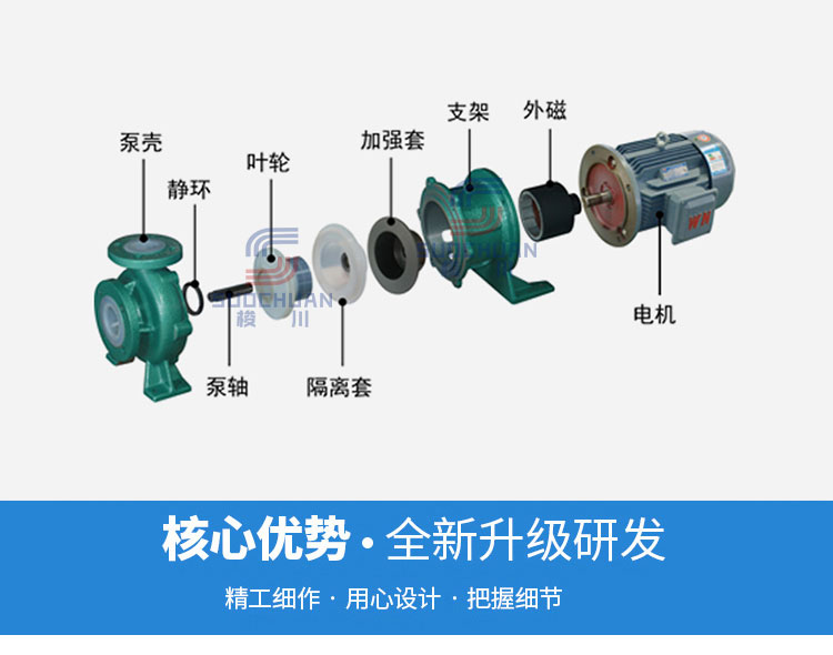 防漏設(shè)計(jì)取消了軸封,利用磁力耦合間接驅(qū)動(dòng),有效消除了滴漏的煩惱,絕不污染場(chǎng)地。由于泵的過(guò)流部分選用“氟塑料合金”制造。可連續(xù)輸送任意濃度的酸、堿、強(qiáng)氧化劑等腐蝕介質(zhì)而毫不受損。