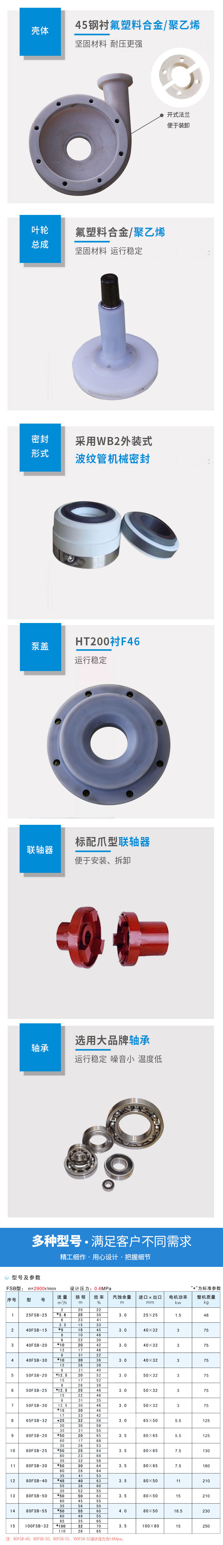 用途 本產(chǎn)品廣泛適用于:汽車制造中的酸洗、噴漆工藝:有色金屬治煉中的電解液輸送:離子膜燒堿項(xiàng)目中的氯水、廢水處理和加酸等工藝流程。使用溫度:-20℃~100℃。 設(shè)計(jì)特點(diǎn) FSB和FSB(D)型離心泵,過流部件全部采用氟塑料合金制造,結(jié)構(gòu)緊湊、操作簡(jiǎn)單、價(jià)格低廉。兩種型號(hào)的泵殼、葉輪、機(jī)封等均可互換使用,深受農(nóng)藥、電子、造紙等行業(yè)的歡迎。